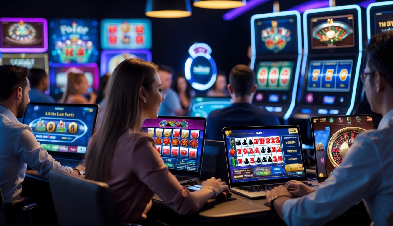 Orang-orang dari berbagai latar belakang bermain judi kasino online di rumah dengan perangkat digital.