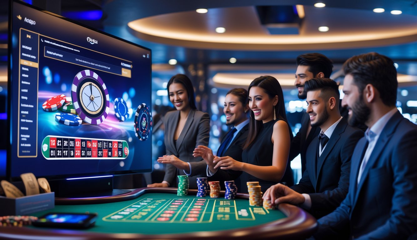 Orang-orang sedang bermain kasino online secara langsung di lingkungan kasino modern dengan antarmuka digital dan suasana yang profesional.
