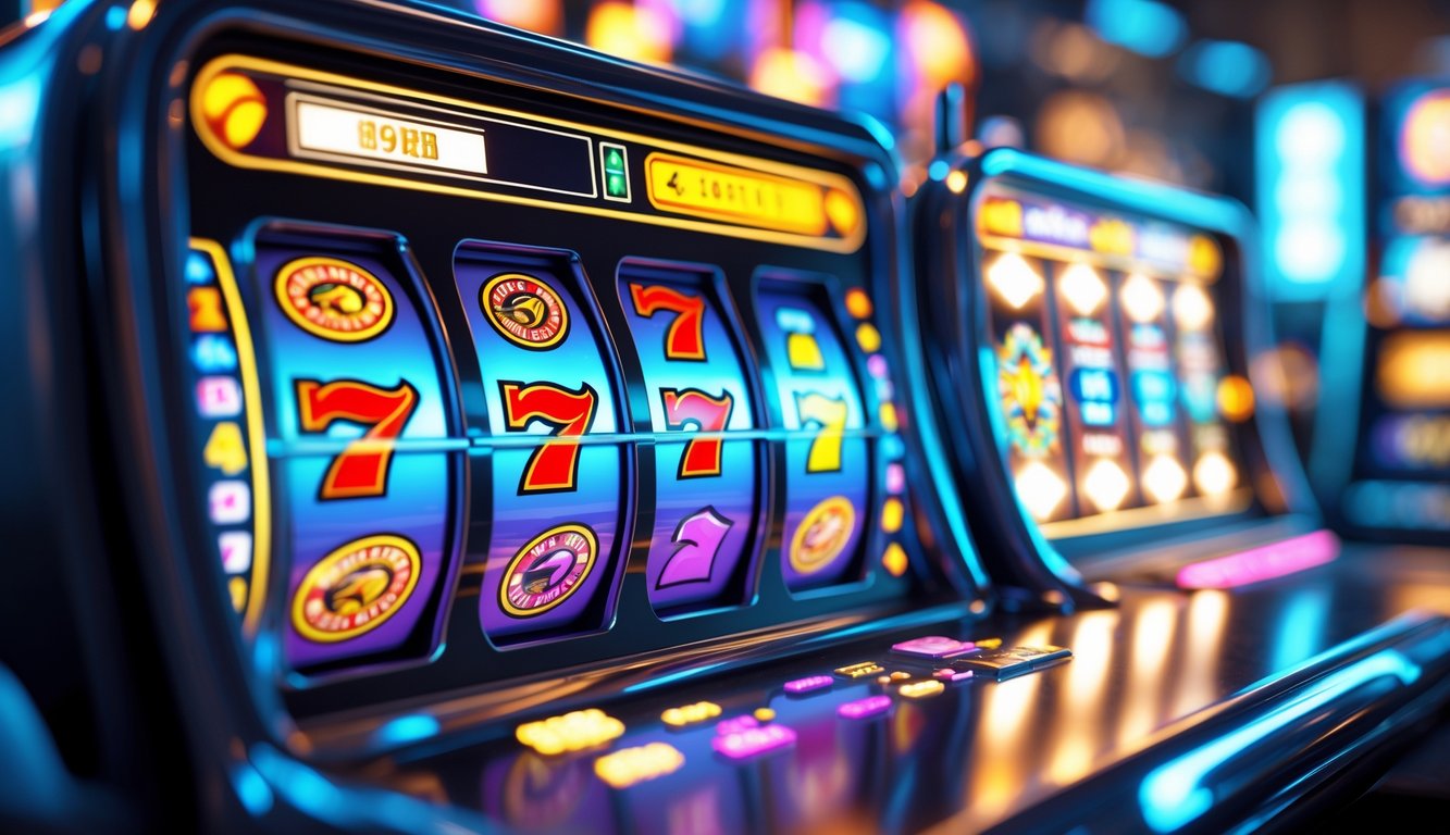 Layar mesin slot digital modern dengan simbol-simbol mesin slot yang berputar dan warna-warna cerah.